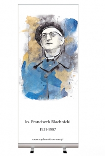 Roll-up (rozwijany baner) ze zdjęciem o. Franciszka Blachnickiego.